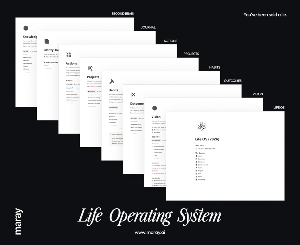 - ✓ The Complete Life OS System: Six interconnected dashboards for Vision, Projects, Actions, Habits, Knowledge, and Obstacles, built inside Notion.